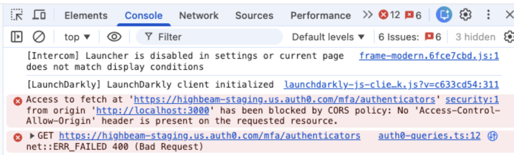 Access to fetch at ‘https://highbeam-staging.us.auth0.com/mfa/authenticators ’ from origin ‘http://localhost:3000 ’ has been blocked by CORS policy: No ‘Access-Control-Allow-Origin’ header is present on the requested resource.